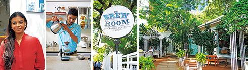 左から:オーナー一族の一人、ニヴルティ・ルディさん。/サイフォンでコーヒーをいれるスタッフ。様々な方法でコーヒーが抽出される様を眺めるのも楽しい。/サヴェラ・ホテルの敷地の一角に立つ。店名は「コーヒーをいれる部屋」という意味。/緑豊かなガーデンテラスを通って、店内へ。空間を贅沢に使ったレイアウトだ。