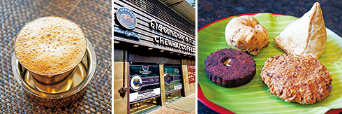 左から:マドラスコーヒー。泡立てることで口当たりが良くなり、液温も適度に下がる。/南インド独特の軽食ティファンとコーヒーを楽しむ店。軽食は別のところにあるキッチンから日に2度、作り立てが届けられる。/右上から時計回りに、サモサ、ワダ、カトゥレットゥ、別種のワダ。