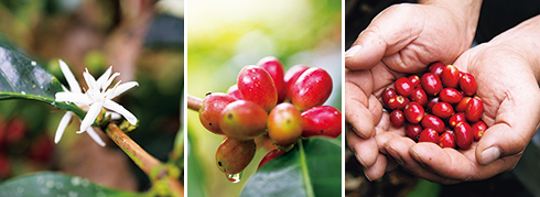 左から:コーヒーの花。/高橋さんが「張りがあって元気だ」と評した昨年のゲイシャ種コーヒーの実。/エチオピア原産のゲイシャ種は、収穫量が少ないが、個性的な芳香によってパナマで再評価され、世界で一躍名を轟かせた。