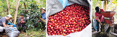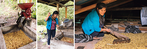 左から:収穫作業の休憩時間に地元の農夫たちは、乾燥したコカの葉を粉末状の石灰とともに咀嚼する。疲労感と空腹感が薄れるそうで、アンデス地域では広く嗜好されている。その間、高橋さんはコーヒーの実の出来具合を確認。/ウァヤバンバ渓谷での収穫期は4月から11月まで。/収穫したコーヒーの実は、その日に果肉除去機にかけて、外皮と果肉を取り除く。