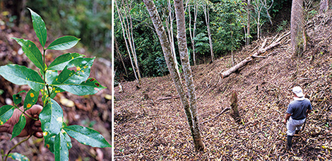 左から:さび病の症状がみられる葉。/ティピカ種が全滅し、ゲイシャ種の植え替えを行う畑。