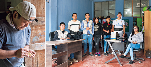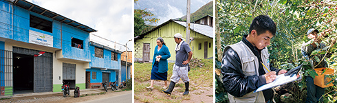左から:アプリサ事務所。収穫期には生産者が続々と納入に訪れる。中では山積みになったコーヒーが出荷を待つ。/組合員をまめに訪問して相談に応じる高橋さん。/地元大学の農学部出身の組合職員が生産者の農園を訪れて、近況を調べて記録を取って回る。