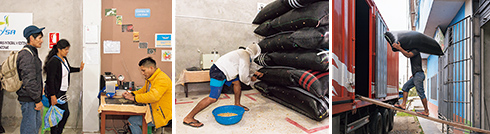左から:生豆を組合に納入する生産者。/輸送業者への出荷前に、品質保証のために生豆のサンプルを採取。/リマに向かうコンテナにコーヒー袋を積み込む。こうして日本にも輸送されるのだ。