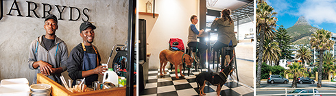 左から:屈託のない笑顔を見せるスタッフ。/「ジャリズ・エスプレッソバー+イータリー」の店内。簡素なインテリアにもポリシーが窺われる。/シー・ポイントからライオンズ・ヘッドを望む。