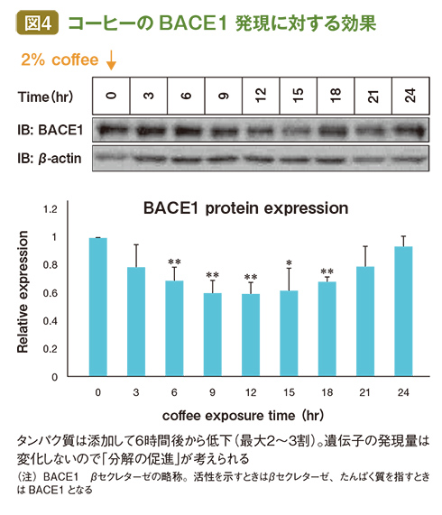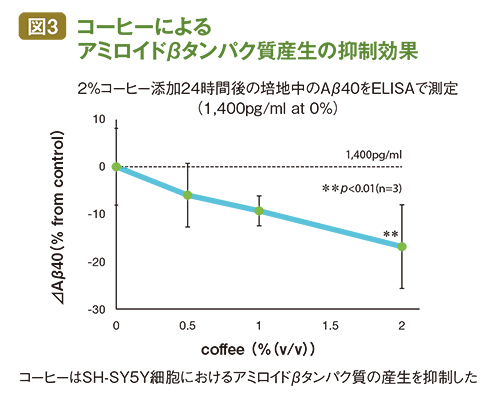 最初に、がん細胞のように増えつづける性質をもった「ヒトの神経芽細胞腫」(SH︲SY5Y細胞)の培地に2%に希釈したコーヒーを添加し、24時間後のアミロイドβタンパク質の量を量った。するとコーヒーを添加しない場合に比べて2割ほど量が減っていた。(図3)