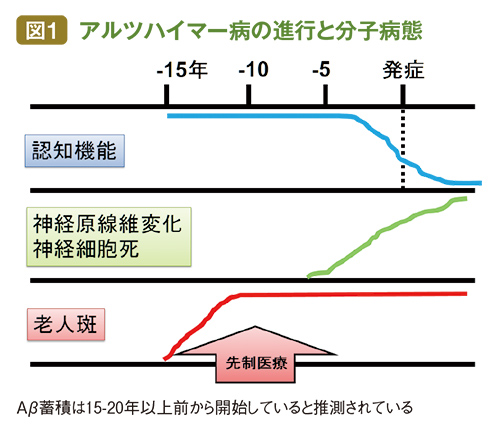 田村さんによると、認知症のおよそ7割がアルツハイマー型認知症で、その原因が長い年月をかけて脳細胞につくられる「老人斑」(ろうじんはん)。老人斑は神経細胞のなかのアミロイドβタンパク質が凝集して毒性をもったもので、ここから神経細胞が変性し、特に記憶や学習の障害を引き起こす。アミロイドβタンパク質は、少量ならば脳の外に排出されて問題ないが、産生が活発になって蓄積異常が起きるとアルツハイマー病を発症すると考えられているのだ。(図1)