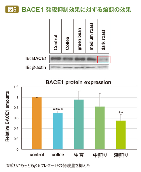 コーヒーの焙煎の違いによってβセクレターゼの発現がどう変わるのか。田村さんは自ら購入した焙煎機を用いて、市販の豆(やや深煎り)、生豆、中煎り(焙煎機で10分間焙煎)、深煎り(同20分間)で比較した。すると深煎りがもっとも発現量を抑える結果となった。(図5)