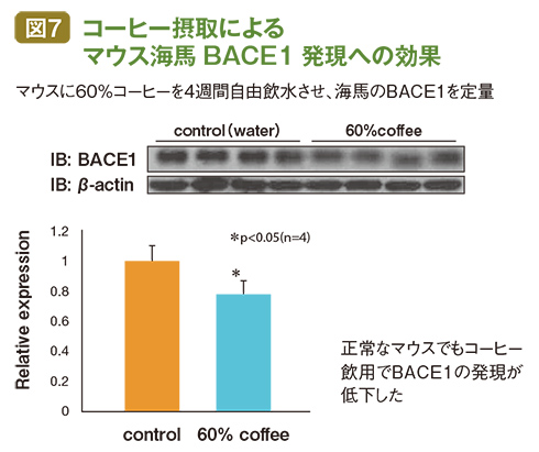 「老人斑の原因となるβセクレターゼの海馬で産出される量を見たところ、コーヒーを飲ませることによってその発現量が低下しました。これはかなり有望な結果です」(図7)