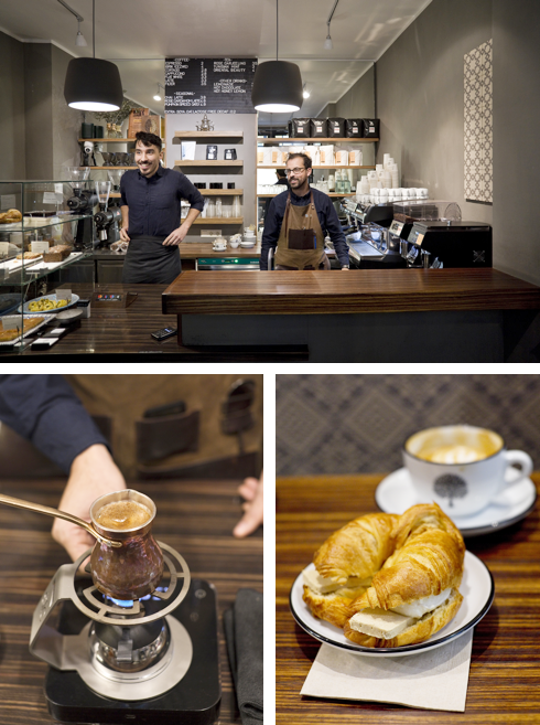 [上]ラヒムさん(右)とスタッフ。各国からバリスタ志望の若者がやってくるという。[左下]店ではアラブ風のモカ「イブリク」も提供。作っている過程を見てもらうのもポイント。[右下]ハルヴァサンドイッチ、2,80ユーロ。リコッタチーズの爽やかな酸味とゴマの香りがコーヒーの味を引き立てる。