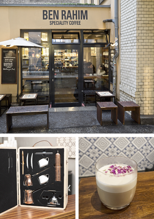 [上]観光客で賑わう、ハケッシェ・ヘーフェの出口側にある店は、地元民の小さなオアシス。[左下]この店でアラブ風モカの虜になってしまうお客も。店内では豪華なキットも販売。[右下]バラの蕾とカフェラテの色が可愛らしいローズラテは、インスタ映えも抜群。