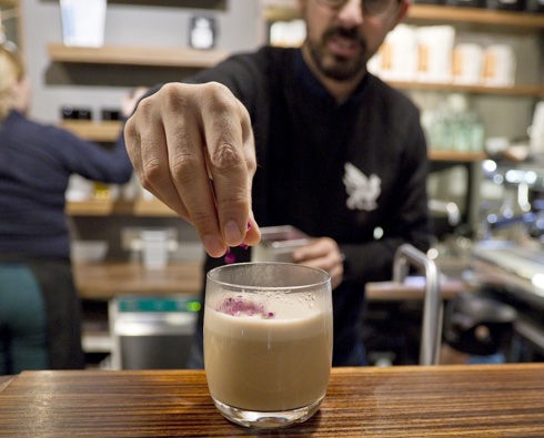 特に女性に人気だというローズ・カルダモン・ラテは、冬限定のシーズンメニュー。4,80ユーロ。花は香りだけで味はあまりつけたくないので、カップにジャスミンウォーターをスプレーし、最後にミルクの泡の上にバラの蕾を散らしてフィニッシュ。