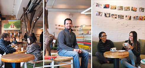 左から:壁材、空調、装飾品などを再利用の建材で内装を仕上げたパルド・イ・アリアガ店。/自身の出身地であるクスコにもプクプクを開店したいと願うゴルディージョさん。/ソファ席で談笑する女性たち。壁にはコーヒー産地での作業風景の写真を展示。