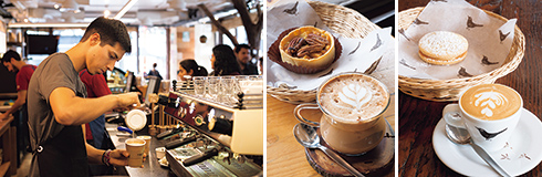 左から:敷地面積120㎡の広々とした店舗で、総勢12人のスタッフが働く。バリスタの真摯に働く姿が印象的だった。オフィス街とあってテイクアウトの注文も多そうだ。/メイプルシナモンコーヒー(11.5ソル)とクルミとリンゴのパイ(12ソル)。/スペイン風カフェオレのコルタード(6.9ソル)と南米のお菓子アルファホール(5ソル)。