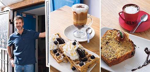左から:スペインでペルー人の奥様と知り合い、クスコに移住したアロンソさん。/モカ(9ソル)とシャンテリー、オレオ、ブルーベリーをトッピングしたワッフル(10ソル)。/マキアート(5ソル)とキヌアケーキ(8ソル)。散策途中にひと息。