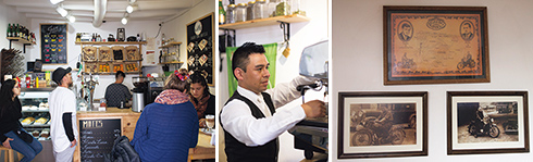 左から:小ぢんまりとかわいらしい店舗は5、6人も入れば満員御礼だ。コーヒーは、エスプレッソをベースとしたドリンクが全18種類。/ネクタイにワイシャツの姿がきりっとしたバリスタ。夜間には別の店でバーテンダーを務める働き者だ。/店名は祖父二人の名に由来。壁には粋にバイクにまたがる祖父たちの写真を展示。