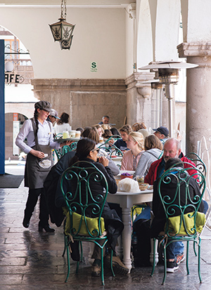 世界的な観光地とあって、来店者の8割は観光客だ。見どころが尽きないクスコだが、3400mという高地にあり、石畳の坂道が多い。散策に思いのほか体力を消耗するため、道すがら出合ったこのカフェに、ひと時の憩いを求めて立ち寄る客が多いようだ。