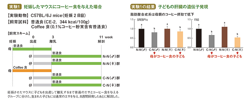 実験1は、まず妊娠させたマウスを2つのグループに分け、1つには普通のエサを、もう1つにはコーヒー食(通常のエサにコーヒーの粉末を0.1%、およそ食後コーヒー1杯分を添加した試料)を、子どもを出産して離乳するまで与えた。生まれた子どもには通常のエサを与え、8週間飼育したあとに解剖し、血清や臓器を採取して分析した。