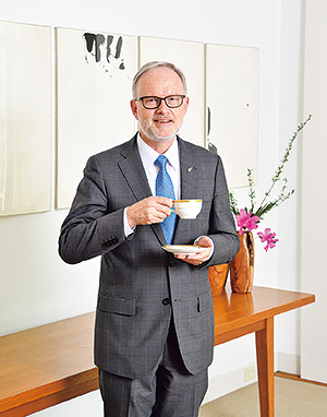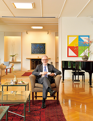 大使公邸でくつろぐスティーブン・ペイトン大使。「コーヒーは毎日、朝食の時にいただきます。あとは音楽を聴いたりしながらリラックスタイムに」
