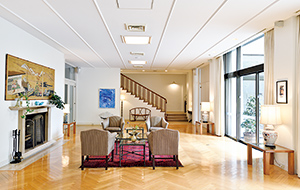 美しい日本庭園の緑を望む公邸の応接室。カーペット、テーブル、椅子に至るまで、公邸内のインテリアは全て本国から取り寄せたものだ。