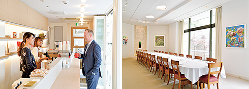 左から:大使館近くにあるニュージーランドのコーヒーが味わえるカフェには大使館スタッフもよく訪れる。今日は参事官がコーヒーブレイク中。/温かみのあるウッディーな家具でまとめられた公邸内。