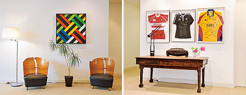 壁を彩るのは本国で活躍する現代アーティストの作品を含め、ヴィヴィッドな絵画。ラグビーのニュージーランド代表選手のサインで埋め尽くされたユニフォームも飾られている。
