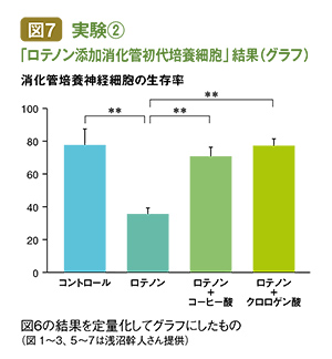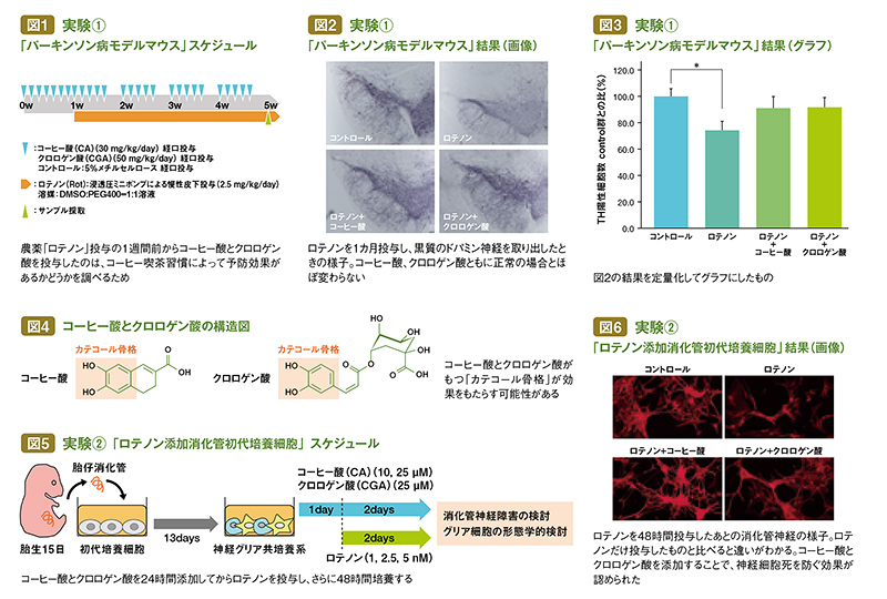 「②は①の動物実験を消化管神経系培養細胞で行なったものと考えてください。コーヒー酸あるいはクロロゲン酸添加で、ロテノンによる消化管神経細胞死が妨げられました」