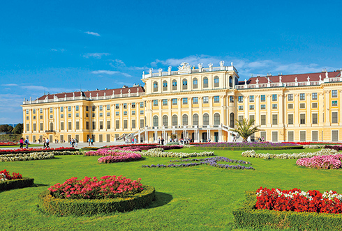 マリア・テレジア・イエローと呼ばれる鮮やかな黄色の外観が印象的なシェーンブルン宮殿。6歳のモーツァルトが演奏した「鏡の間」やウィーン会議(1814〜1815)の舞踏会で使われた「大広間」など見所が多い。庭園の一角に宮殿名の由来となったシェーンブルン「美しい泉」があり、飲料水としても使われていた。