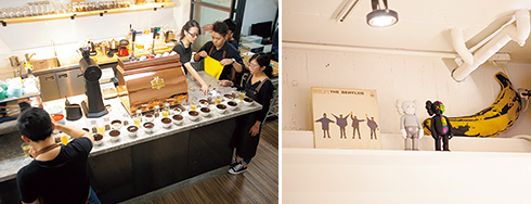 左から:スタッフ総出で定期的にカッピング。/〈ツビ〉のインテリアの一部。提供するコーヒーのクオリティのみならず、店の雰囲気も顧客の評価に大きく響く。