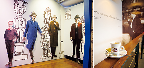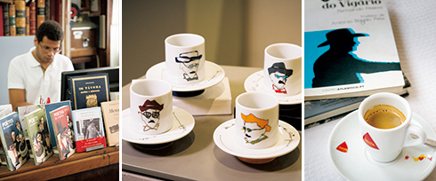 左から:書店のレジ前にズラリと並ぶペソア関連本。/シアード地区の陶器店で見つけたペソアと異名者※たちを描いたコーヒーカップ。/ペソアの詩作にコーヒーはどのような作用をもたらしたのだろう?