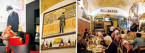 左から:ベルトランド書店のカフェ。ペソアの描かれた壁の前でカフェラテを飲みながらペソアを読み耽る人。リスボンはペソアで満ちている。/店内には立ち飲みするペソアの絵が。/ドン・ペドロ4世広場近くにあるア・リコリスタ・オ・バカリョエイロはペソアが通った店。