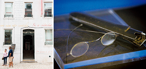 左から:博物館正面。ペソアの詩が壁を埋める。/ペソアのトレードマークでもある眼鏡。