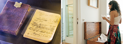 左から:詩やアイデアが書き込まれた手帳。ペソアの詩にはアフォリズム(警句・箴言)と呼ぶべきものも多く、それが人を惹きつける。/復元された”ペソアのトランク”。