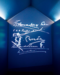 「異名者」はペソアが創り出した人格で、カエイロ、レイスなど、各々が名前と詳細なバックグラウンドと性格を持ち、それぞれに詩作し、互いに批評し合う。現在までに見つかっている異名者の数は72人! 写真は異名者たちのサインを集めた博物館の展示。
