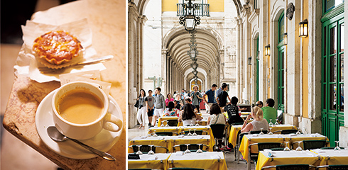 左から:ア・ブラジレイラのミルクコーヒーとチーズの入ったケイジャーダ。/コメルシオ広場に面したアーケード。手前のテラス席はカフェ・マルティーニョ・アルカーダ。ペソアの時代と変わらぬ眺めだ。