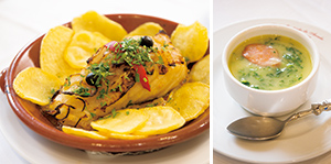 左から:ペソアが好んで食べた干し鱈の料理。/カルド・ヴェルデはポルトガルを代表するスープ。