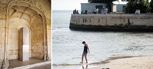 左から:ジェロニモス修道院の回廊にあるペソアの墓。/テージョ川と大西洋の境界に立つベレンの塔の前のビーチ。