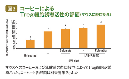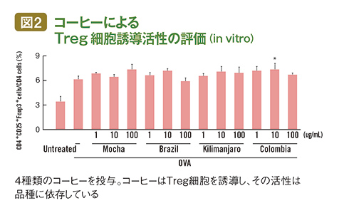 コーヒーの最初の実験は「Treg細胞を誘導できるか否か」だった。マウスの腸にある免疫組織から取り出した細胞に、数種類のインスタントコーヒーを添加すると、いずれのコーヒーでも効果があった(図2)。