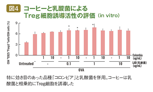 次に、もっとも結果がよかった「コロンビア」を、細胞ではなくマウスに経口投与した。結果は「コーヒーを飲ませると、Treg細胞が増える」という明快なものとなった(図3)。さらに「オマケの実験」(好田さん)として、マウスの細胞に乳酸菌とコーヒーを併用することも試みた。ここでもコーヒーは乳酸菌と相乗的な効果を示し、Treg細胞を増やした(図4)。
