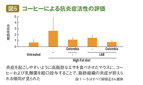 体のなかで起こる慢性炎症の原因はまだよくわかっていないものの、肥満はその一つであると考えられている。そこでまず炎症を起こしやすいように高脂肪なエサをマウスに5週間食べさせ、同時にコーヒーを5週間自由に飲めるようにし、さらに乳酸菌を1~2日おきに5週間経口投与した。その実験結果が「コーヒーによる抗炎症活性の評価」だ。コーヒーや乳酸菌を投与することで、脂肪組織の炎症が抑えられる傾向が見られた(図5)。