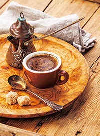 細かく挽いた豆の粉、砂糖、水を「ジェズベ」と呼ばれる小鍋に入れて沸騰させ、上澄みをいただくトルコ・コーヒー。カップの底に残った粉の形で占いをする。