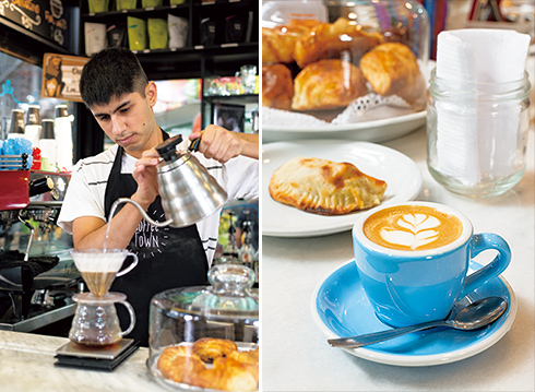左から:世界で人気の器具を揃えて、様々な国のコーヒーを提供。/ブエノスアイレスで定番のコルタード(エスプレッソのカフェオレ)(48ペソ)とブルーチーズのエンパナーダ(28ペソ)。
