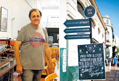 左から:カフェ3店舗、コーヒー学校、そして週末には本店で給仕と大忙しのオーナー、ホセさん。/市場の周辺に看板を出してアピール。