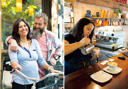 左から:仲睦まじいオーナー夫婦。写真撮影にも自然と笑顔がこぼれた。/バリスタはベネズエラ人女性。似たような境遇の若者をヴィクトリアさんがサポート。
