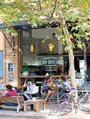 正面のウィンドウにコロンビア豆100%使用を表記して品質をアピール。店舗の左隣に借りた物件をコーヒー学校に改装中。