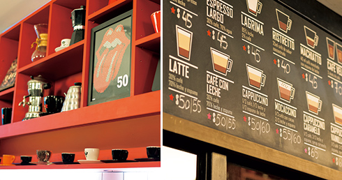 左から:あくまでもポップに革命カラーをアピール。/18種類の異なるコーヒー・ドリンクが楽しめる。食べ物類は少なく、コーヒーで直球勝負。