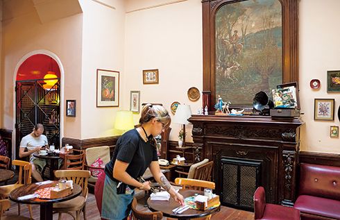 ステンドガラスの天窓と暖炉のある店舗は、古い屋敷を改装したもの。店先の路上席から、暖炉のある応接間を経て陽光の注ぐ裏庭まで、壁や柱に遮られた5つの異なるスペースがあり、用途や気分に応じて選べるのも魅力だ。