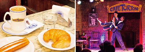 左から:カフェ・トルトーニの定番メニューのコルタード、チュロスとメディアルナ。/カフェ・トルトーニの地下劇場では毎晩タンゴショーが行われている。