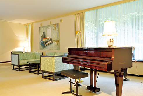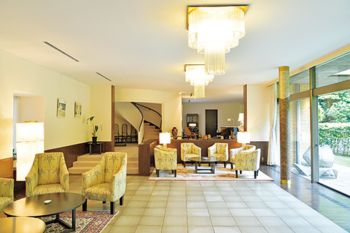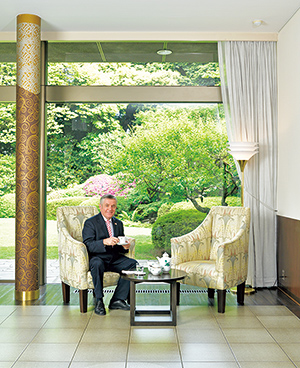 日本庭園を望む大使館のサロン。柱の模様はオーストリアを代表する画家クリムトのモチーフからインスピレーションを得たものだ。