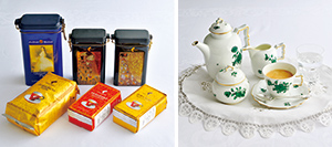 左から:アートがあしらわれた美しいパッケージのコーヒー豆。/ウィーン・アウガルテン磁器工房のコーヒーセット「マリアテレジア」シリーズ。