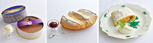左から:ハプスブルク家に愛された、世界でもっとも有名なチョコレート菓子、デメルトルテ。/ザルツブルガーノッケルン。スフレが連なる山々のように。/アプフェルシュトゥルーデル。透けるほど薄く伸ばした生地でリンゴやレーズンを巻いて焼き上げる。